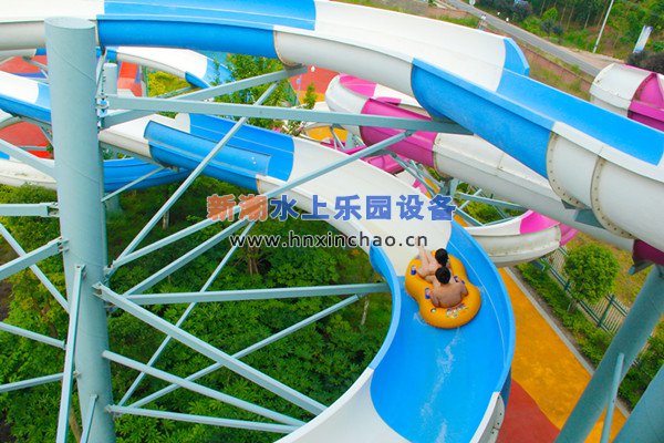 螺旋滑梯兩條滑梯。游客乘坐特別設計的雙人浮圈,通過100多米的螺旋滑梯,一路上旋轉加速,充分感受離心力后,再經過曲形管道,沖入下面的水池。體驗慣性沖力,讓您身體的每一個細胞在螺旋滑道中無法受控的刺激,適合男女朋友共同體驗。